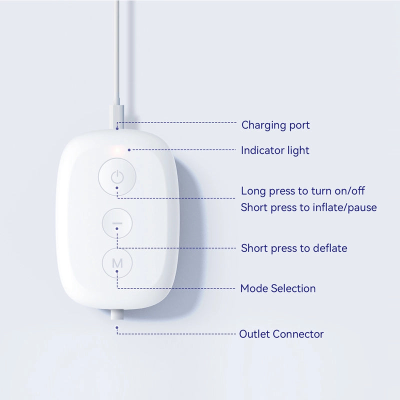 Compact pressure-controlled pump, a single charge can be used for 1-3 days, without the use of "M" automatic mode, can be used for three days of continuous use, manual mode, you can inflate or deflate at any time, and can be paused at any time.