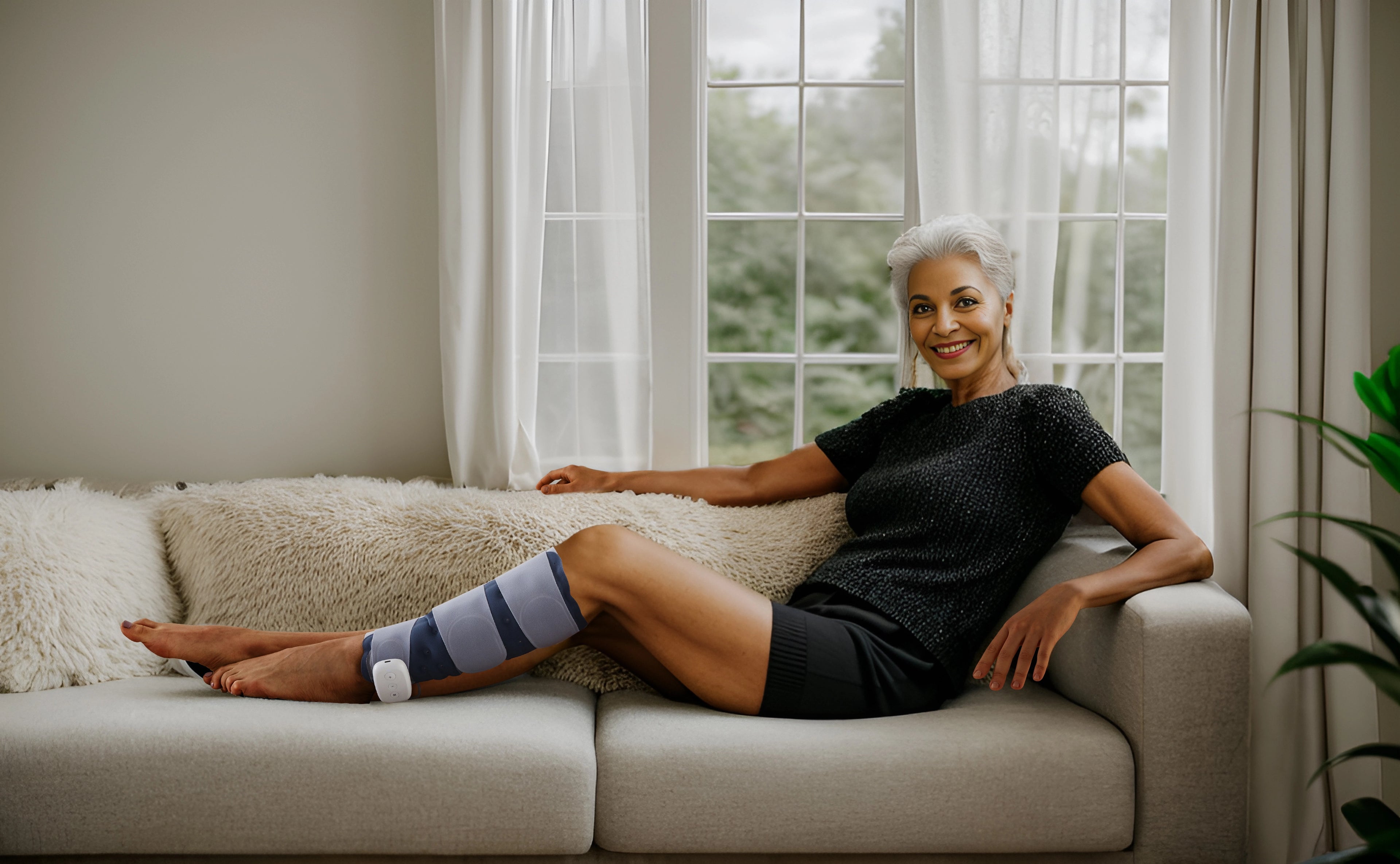"Awesome. Since I've been using it, I can wear it all the time for walks to the park, I usually use less pressure when I walk, and when I'm relaxing at home, I'll use the M button to go into auto-relaxation mode, and it's lightweight design is easy to put on over your pants, though looser pants are recommended." -- Daisy E. CA